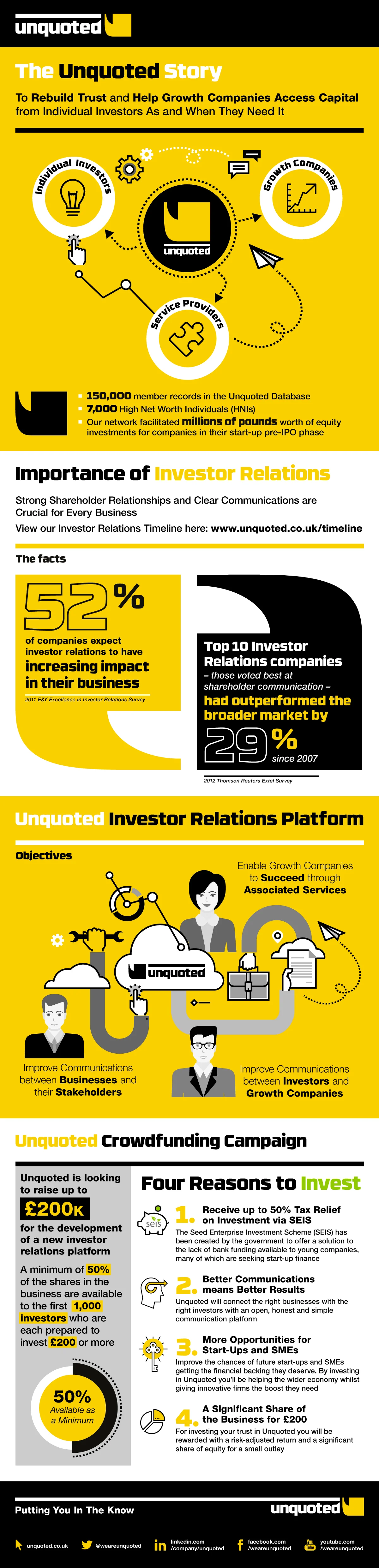 Last week I created an infographic for Unquoted, who are launching a crowdfunding campaign to raise money to build an Investor Relations platform. The infographic is split into four sections that they can share over their social platforms to help spread the word to potential investors.